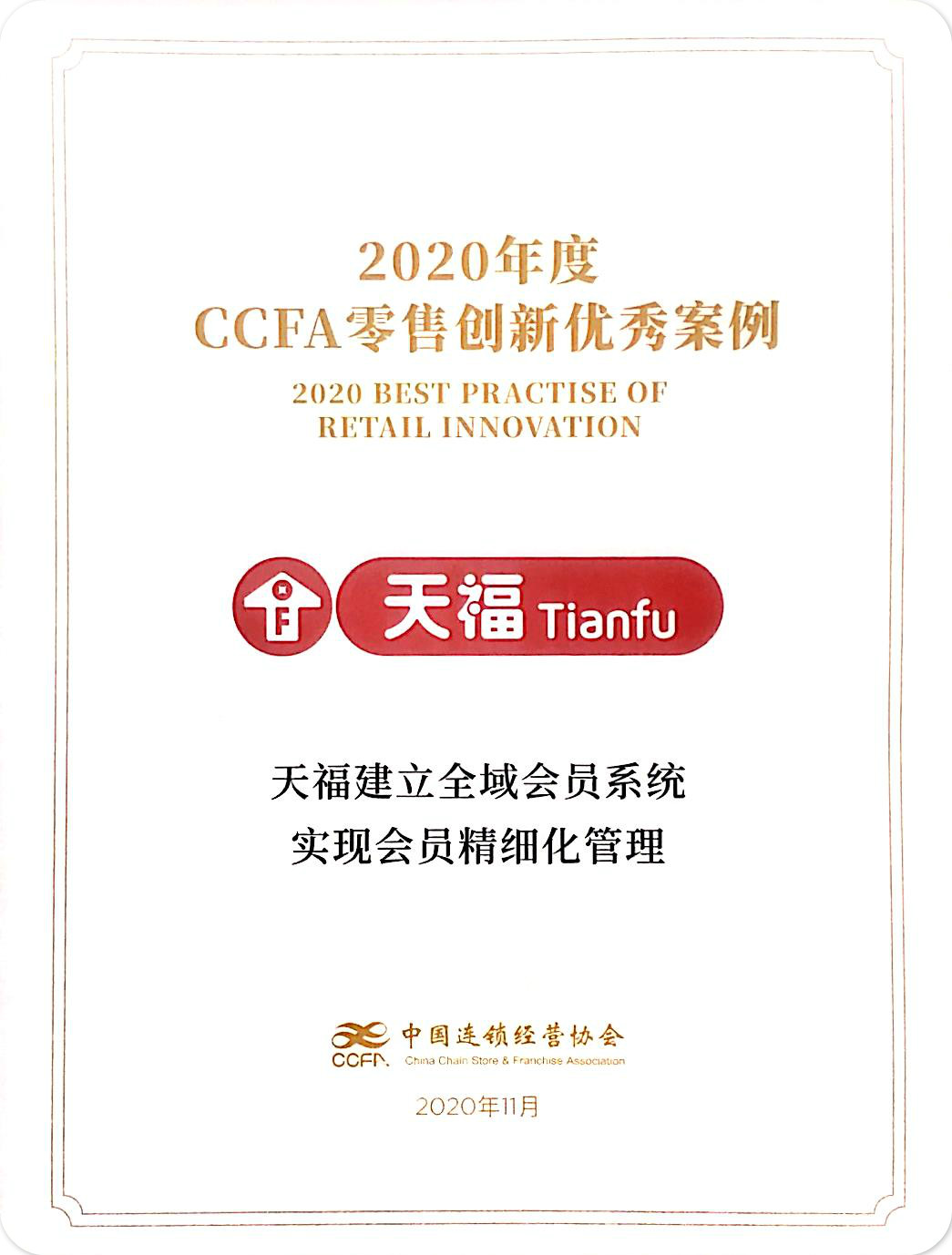 在中國全零售大會上,揭曉了2020年度零售創新優秀案例,并舉行了證書頒發儀式,本次評選共收集了69個有效創新案例,聘請行業權威專家組成評審委員會,秉承公正、科學的評選標準,從創新、影響、發展潛力、借鑒價值四個維度綜合衡量。經過評委會初審、復審和合議終審三個階段,最終有24家企業獲得2020年度零售創新優秀案例。天福以“建立全域會員系統實現會員精細化管理”,榮獲2020年度CCFA零售創新優秀案例——最佳會員運營。