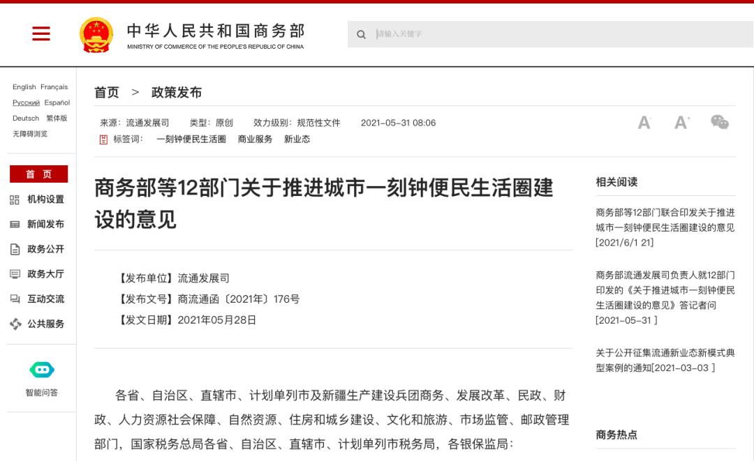 《關(guān)于推進(jìn)城市一刻鐘便民生活圈建設(shè)的意見》
