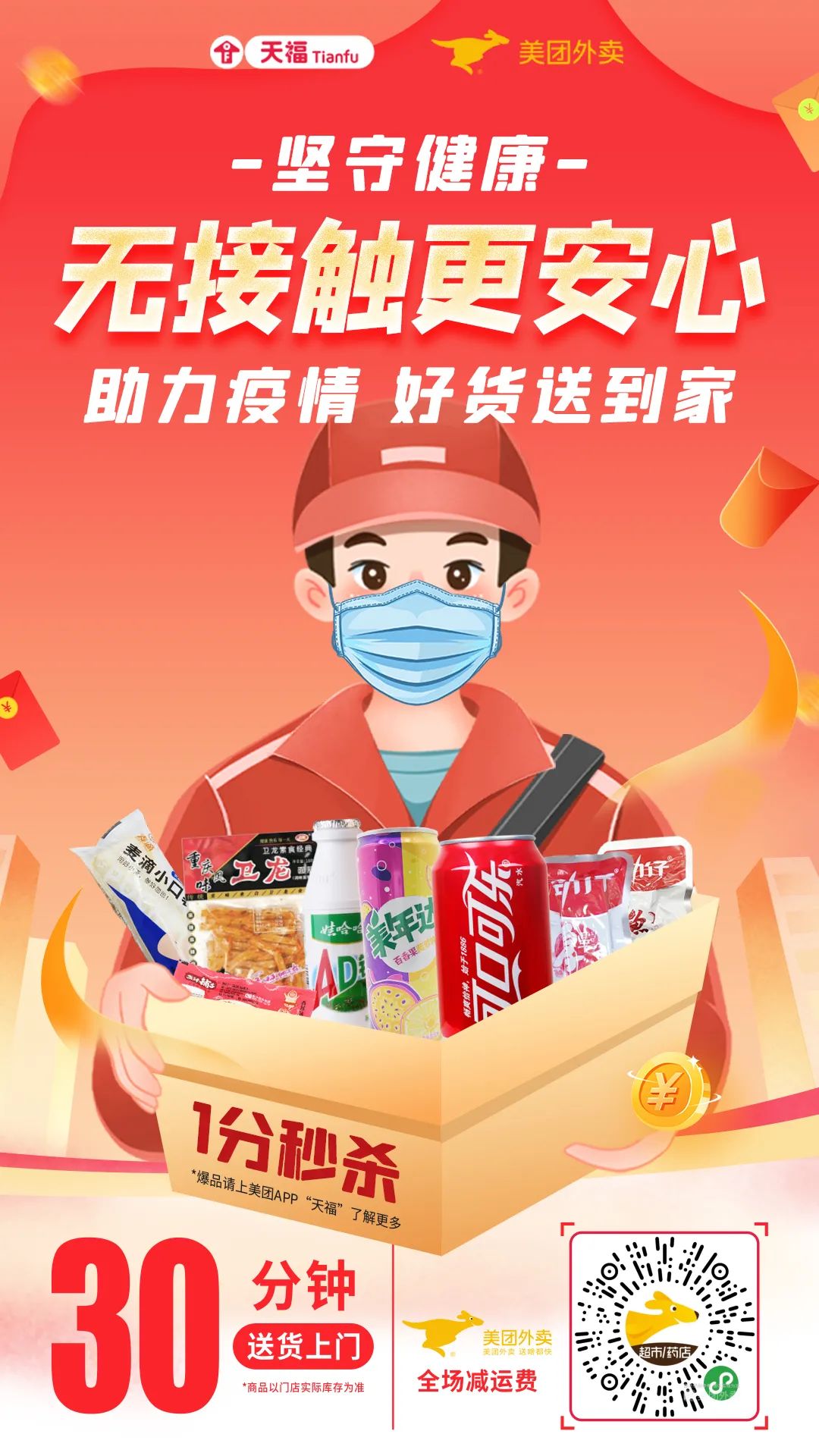 同時,為鼓勵市民避免前往人群密集場所,天福積極推動門店上線外賣平臺,推出外賣“全場免運費”活動,確保物資覆蓋周邊更多消費者,充分滿足顧客需求,足不出戶也能讓好貨一鍵到家!