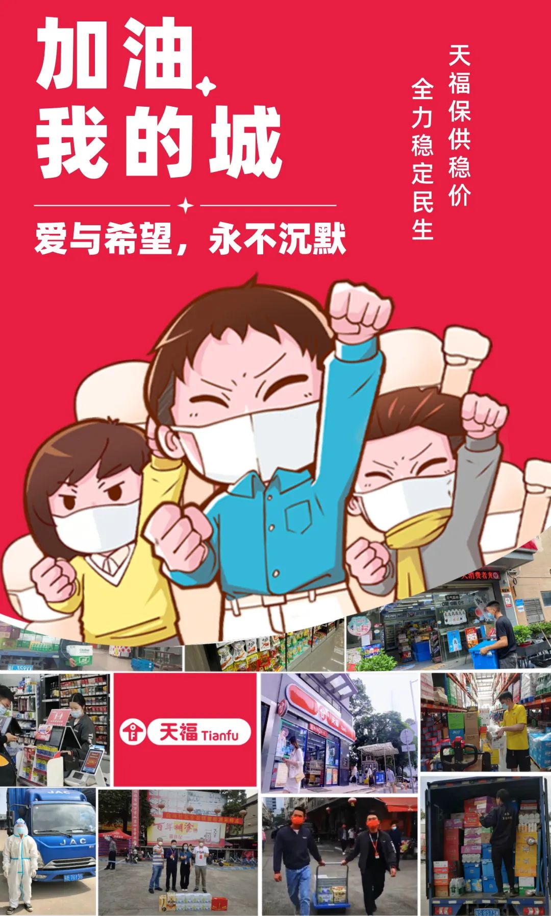 齊心戰疫,共克時艱!疫情當前,天福攜6600多家門店鄭重承諾,將積極落實相關措施,全力滿足廣大市民生活需求,積極擔負起抗疫保供責任。